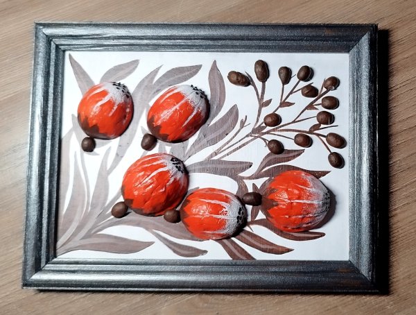 Аппликация из скорлупы грецких орехов, изображающая воробьев на ветках, – это удивительное произведение рукоделия, которое подарит прекрасную атмосферу природы и творчества вашему дому или офису. Каждый элемент этой уникальной композиции создан вручную с помощью тонкой обработки скорлупы грецких орехов, чтобы передать каждую мельчайшую деталь перьев воробьев и особенности веток. Благодаря натуральному материалу и мастерскому исполнению, эта аппликация привнесет неповторимый шарм в интерьер и станет прекрасным акцентом в любом помещении.