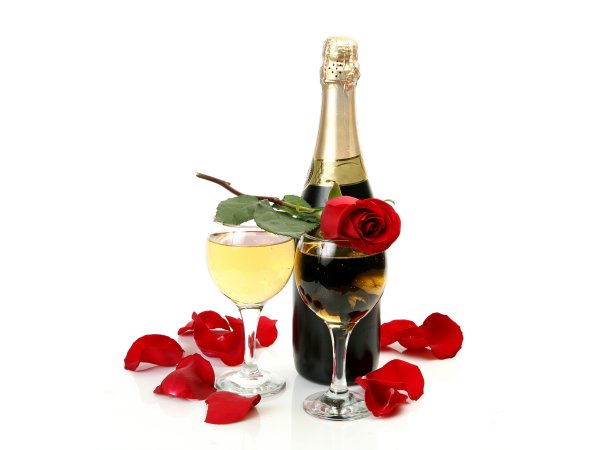 Шампанское и цветы на белом фоне