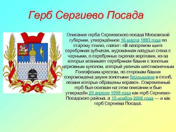 На прозрачном фоне представлена красивая картинка герба Сергиева Посада. Герб выглядит величественно и символично, олицетворяя богатую историю этого знакового города. В его центре находится изображение собора, что является одной из самых значимых достопримечательностей Сергиева Посада. Вокруг собора расположены символы, отражающие различные аспекты жизни города: золотые колосья, символизирующие земледелие; серебряные кирпичи, отражающие развитие строительства; и красные гранаты, символизирующие богатство и процветание. Все эти элементы, сочетающиеся друг с другом на фоне сергиево-посадских цветов - синего и золотистого - создают прекрасное визуальное впечатление и передают особый дух этого уникального города.