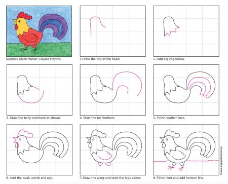 Наши пошаговые инструкции помогут вашему ребенку нарисовать курицу легко и быстро. Сначала возьмите карандаш и начните с основных форм - тела и головы. Затем добавьте детали, такие как клюв, шея и хвост. Не забудьте про крылья и ноги! Постепенно заполните контуры, придавая изображению объем и текстуру. В конечном итоге, у вас будет яркий и милый рисунок курицы, который понравится вашему малышу!