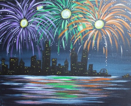 «Праздничный салют над городом» (восковые мелки + акварель)