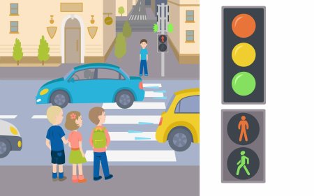 Дети переходят дорогу на зеленый