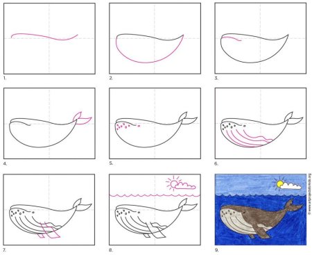 Поэтапные схемы рисования кита для детей