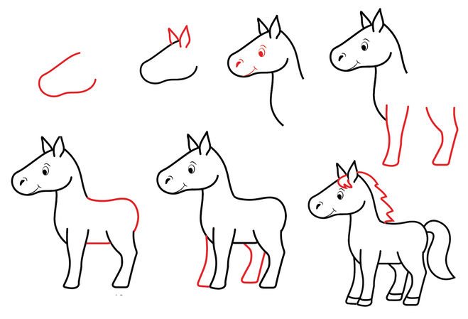 Поэтапный рисунок лошади для детей