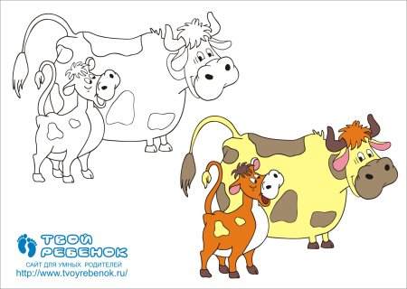 Раскраска корова с теленком