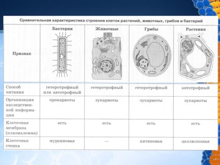 Растительная животная грибная и бактериальная клетки таблица
